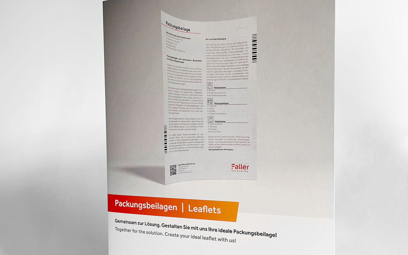 Faller Packaging versorgt seine Kunden seit vielen Jahren mit Packungsbeilagen in individuellen Größen, Formaten und Materialien, abgestimmt auf das jeweilige Produkt sowie die Abläufe und Gegebenheiten in dessen Produktion. So bekommen Patienten bequem und zuverlässig sämtliche Informationen, die sie benötigen. Alle Packungsbeilagen entstehen in GMP- und FDA-konformer Fertigung unter höchsten Qualitäts- und Sicherheitsstandards.
