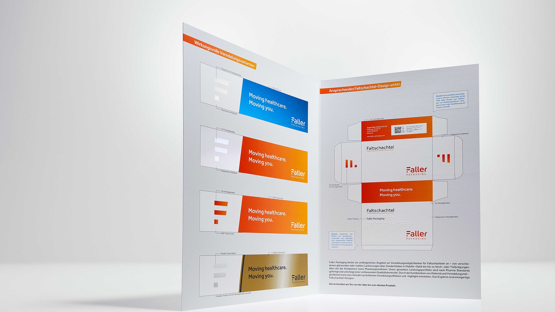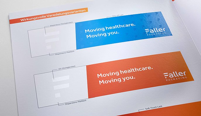 Faller Packaging stworzyła w tym celu szerokie portfolio technik wykończeniowych. Pozwala to na stworzenie szerokiego wachlarza efektów wizualnych i dotykowych, które pomogą Państwu wyróżnić swoje opakowanie farmaceutyczne na tle konkurencji i odpowiednio pozycjonować swoją markę. Należą do nich powierzchnie o wysokim połysku, efekty matowe/błyszczące, specjalne kontrasty, błyszczące efekty kolorystyczne lub tłoczenia. Wykończenia mogą również zapewnić dłuższy okres trwałości opakowań leków i zwiększoną odporność na różne czynniki zewnętrzne.
